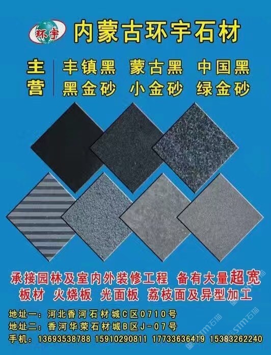 內(nèi)蒙古環(huán)宇石材,專營各種黑色花崗巖。光面、火燒面、自然面、荔枝面、剁斧面。各種異形加工。工程以及家裝均可