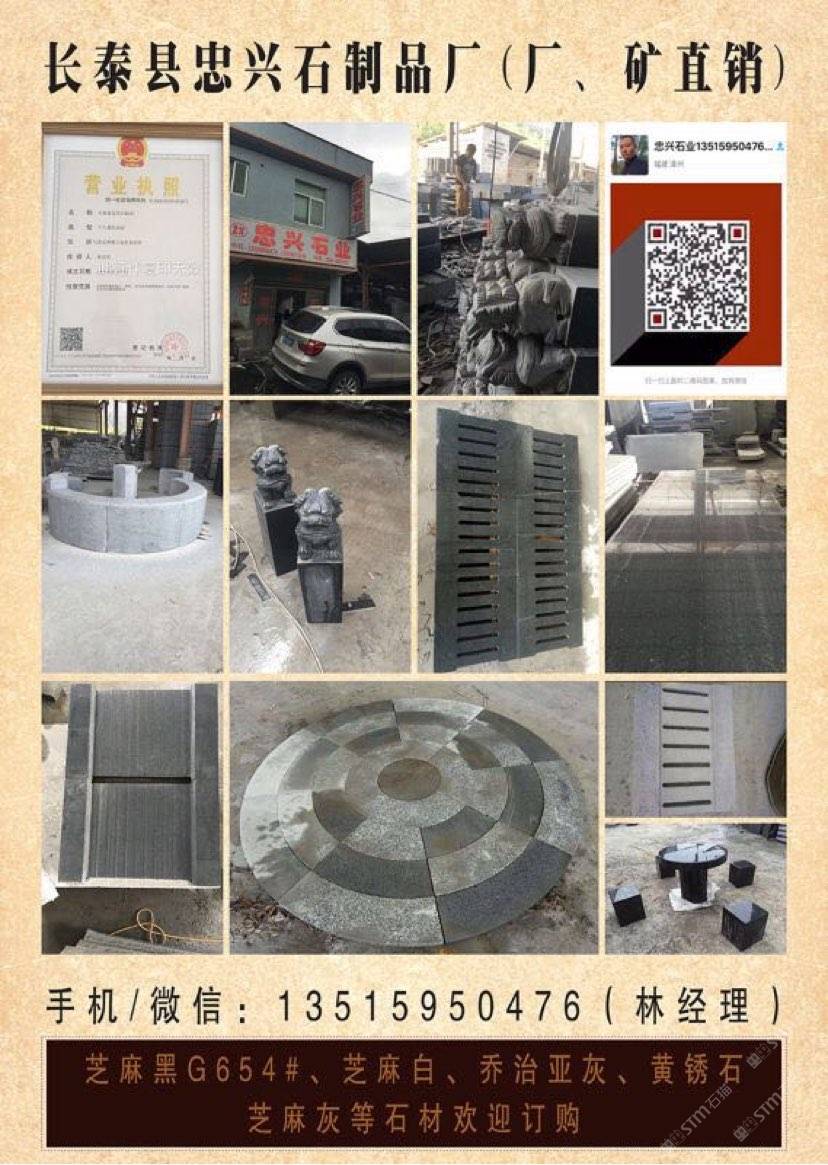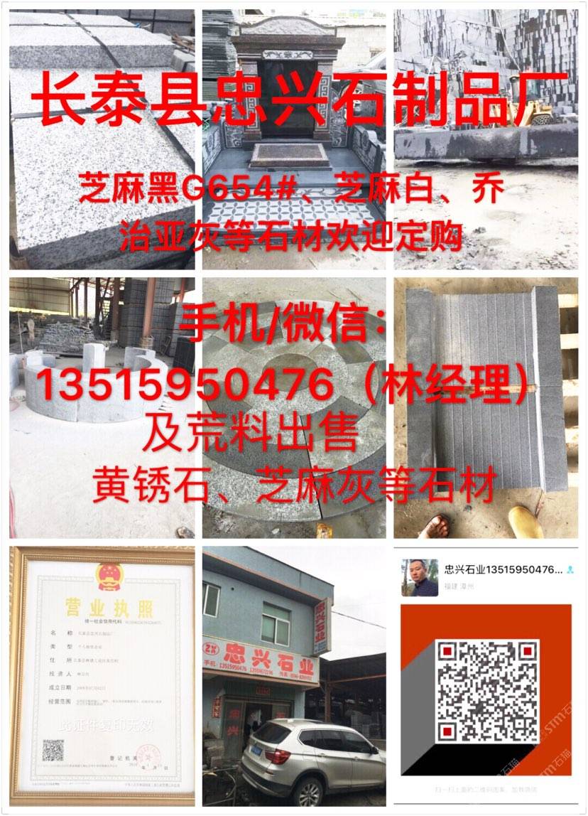 【長(zhǎng)泰縣忠興石制品廠】礦區(qū)直銷、誠(chéng)信經(jīng)營(yíng)。(正常規(guī)格全部特價(jià)處理)專注:園林、市政工程.異形..別墅.荔枝面、火燒面、仿中國(guó)黑、墓碑石、荒料礦山直銷:G654芝麻黑 、G655芝麻灰 、黃銹石等。 我廠離廈門機(jī)場(chǎng)(50公里);距離高鐵廈門北站(40公里)導(dǎo)航地址:(長(zhǎng)泰縣忠興石制品廠)地址:福建省長(zhǎng)泰縣林墩美宮工業(yè)區(qū)。 電話/微信號(hào):13515950476林經(jīng)理[握手] 歡迎到工廠考察、誠(chéng)信服務(wù),合作互利,感恩有你!