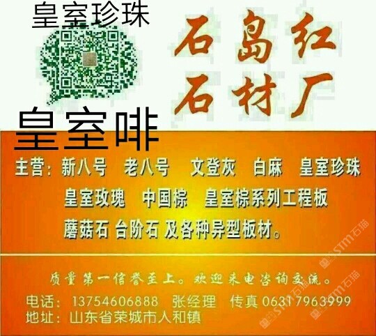 該企業(yè)尚未填寫簡介,請補充!山東石島紅石材廠主營 新八號 老八號 文登灰 白麻 皇室珍珠 皇室玫瑰 中國棕 皇室宗系列工程板 蘑菇石 臺階石 及各種異型板材。質量信譽至上。歡迎來電咨詢交流。電話 13754606888 張經(jīng)理 傳真 0631 7963999。 qq 245382641