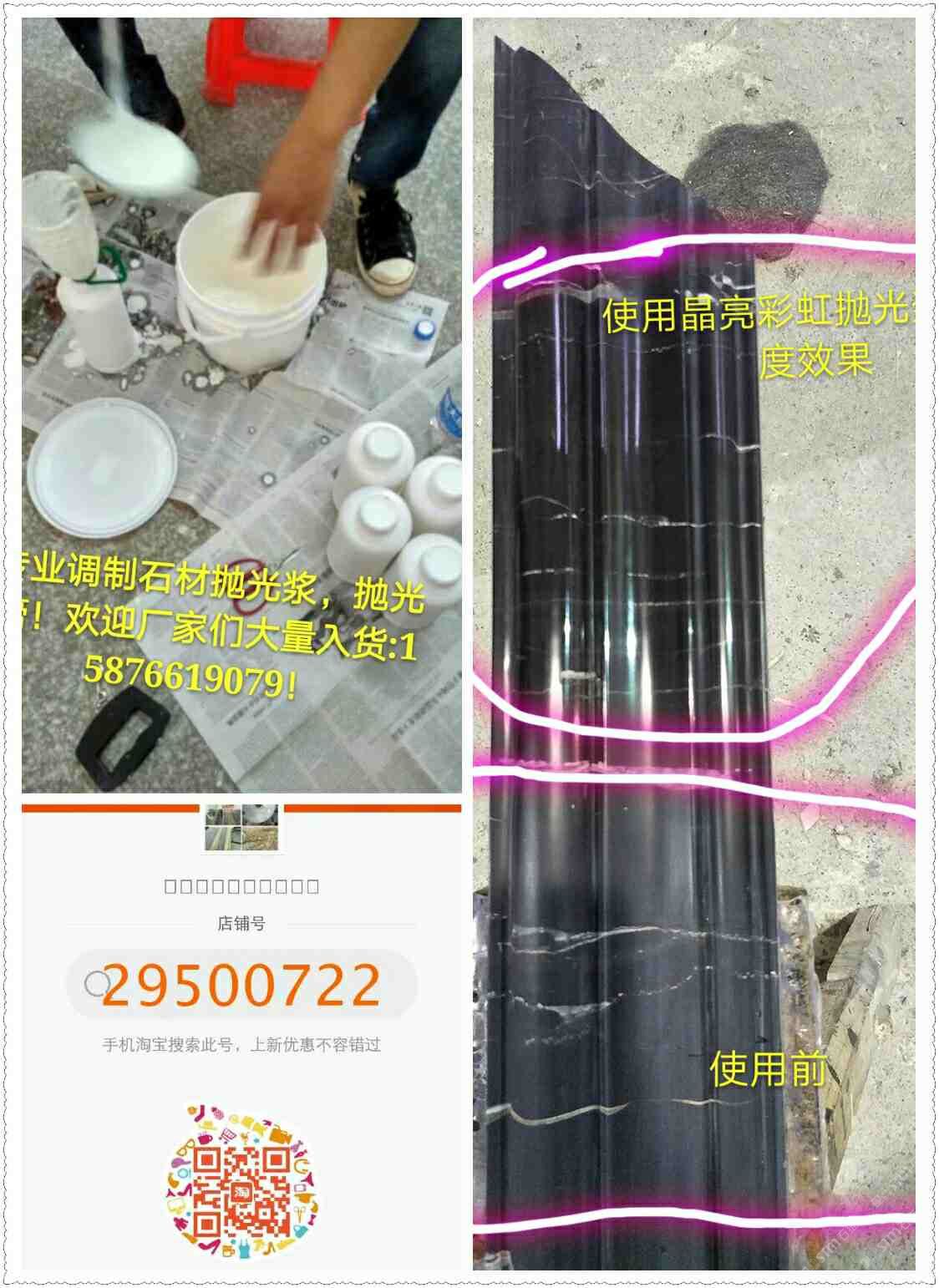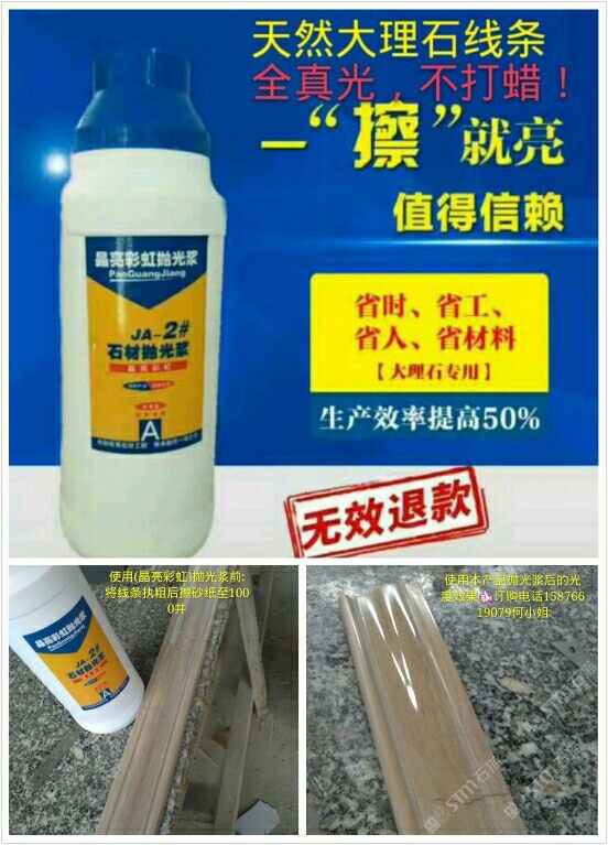 (晶亮彩虹拋光漿)為配方調(diào)制。從2016年5月份開始靠著技術員親自逐間上門到云浮多家石材工藝廠施展產(chǎn)品使用技術和試驗產(chǎn)品光度效果取得了各家老板和工藝師們的稱贊和認可,通過短短一年的時間品牌:晶亮彩虹拋光漿全國省地已約2000家石材廠正在使用,市場反應效果顯注,現(xiàn)面向全國誠招代理商。客服熱線:15876619079