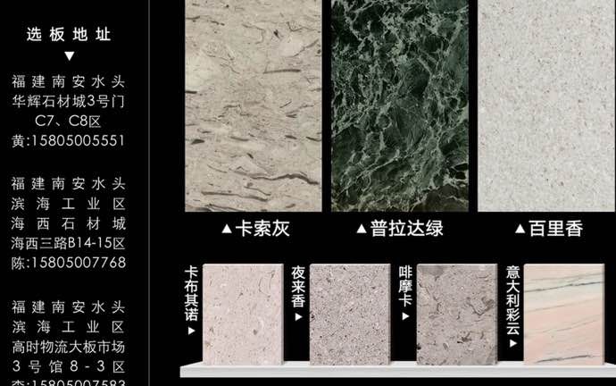 自有礦山——黃金桂。意大利:百里香,啡摩卡,夜來香,廣安灰,新廣安灰,普拉達綠,魔力點子,彩云,卡索灰,蝴蝶灰。