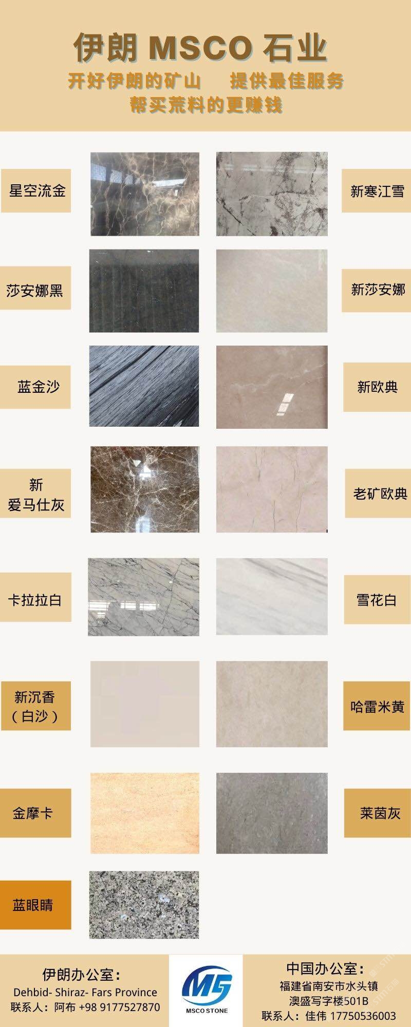 伊朗MSCO公司具備接近15年石材供應(yīng)及礦山經(jīng)營(yíng)的豐富經(jīng)驗(yàn)。目前我司在伊朗經(jīng)營(yíng)兩座自有的大理石礦山,此外多年以來已包過近十座礦山。MSCO公司主營(yíng)產(chǎn)品種類包括大理石,石灰石,花崗巖。對(duì)于伊朗新老礦品種感興趣的企業(yè)老板們,歡迎隨時(shí)聯(lián)系咨詢我。