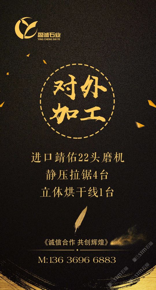 加工廠內(nèi)設(shè)進(jìn)口靖佑22頭磨機(jī),靜壓拉鋸4臺,立體烘干線1臺。5臺快鋸、16頭自動磨、3臺中切機(jī)、雙層補(bǔ)板線及烘干線、紅外線橋切、倒角磨邊機(jī)械、大型工程深加工,集設(shè)計(jì)、銷售,加工一體化流水式作業(yè)。承接外墻干掛、園林鋪地、異形加工、條板批發(fā)及出口訂單。本公司一直堅(jiān)持從礦山源頭把關(guān),為客戶爭取更大的品質(zhì)與優(yōu)勢