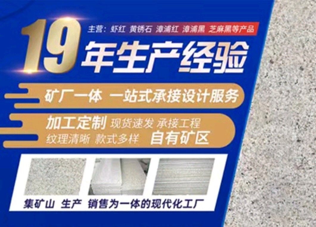 漳浦縣鴻勝石材有限公司是一家集礦山開采、自營(yíng)加工生產(chǎn)、自主產(chǎn)供銷為一體的石業(yè)公司,公司擁有數(shù)家生產(chǎn)基地、手工加工場(chǎng)、大型礦山。公司創(chuàng)業(yè)歷程10年,憑著豐富的加工生產(chǎn)經(jīng)驗(yàn)、雄厚的技術(shù)力量和先進(jìn)的設(shè)備,產(chǎn)品遠(yuǎn)銷歐美、韓國(guó)、新加坡、臺(tái)灣等地,深受客戶的信賴與好評(píng)。 本公司產(chǎn)品主要有: 漳浦紅,漳浦黑,漳浦青,漳浦蝦紅,漳浦銹石,福建青,安山巖,芝麻黑,芝麻灰,沙漠棕等。