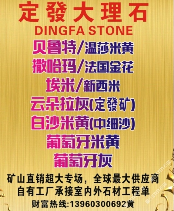 發(fā)布信息: 貝魯特/溫莎米黃,工程外墻干掛? 葡萄牙米黃/葡米,工程外墻干掛★ 撒哈瑪/法國金花,室內(nèi)外材料?? 埃米、新西米,超白低室內(nèi)外材料★ 云朵拉灰,專為工程而打造,超性價比 白沙米黃/中細沙,室內(nèi)外材料?? 令每個工程交付,做到驗收無憂???? (質(zhì)與量的保障者、經(jīng)得起層層考驗)???? 全球供應(yīng)商,各大地產(chǎn)指定供應(yīng)商? 承接國內(nèi)外室內(nèi)外石材工程訂單???? 致富專線:13960300692黃