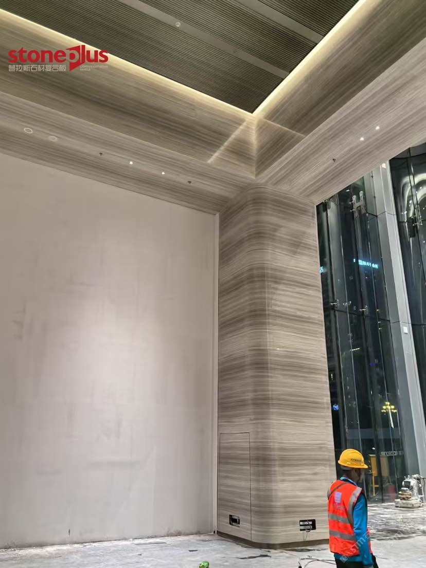 發(fā)布信息: 澳門中心位于廣州市黃埔區(qū)魚珠片區(qū),項目定位為商業(yè)商務(wù)綜合體打造以港澳特色為主的、有國際影響力的科技金融和數(shù)字經(jīng)濟(jì)總部基地,并大力引入澳門文化和商業(yè)業(yè)態(tài),打造充滿澳門風(fēng)情的文創(chuàng)藝術(shù)街區(qū),實(shí)現(xiàn)科技金融產(chǎn)業(yè)一體化、粵澳葡三地合作一體化。 其中大樓室內(nèi)墻面采用白木紋復(fù)合鋁蜂窩,預(yù)埋螺栓打孔后再進(jìn)行復(fù)合,到現(xiàn)場進(jìn)行干掛安裝;包柱采用白木紋復(fù)合鋁蜂窩平板拼弧工藝,對手加工工藝要求較高,我們普拉斯加工對品質(zhì)的追求與現(xiàn)場的安裝效果相得益彰。