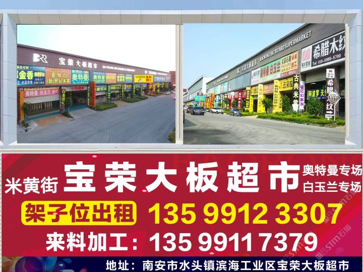 寶榮大板超市 聯(lián)系人:王    134****5689 查看 135****3307 查看 主營范圍: 石材交易市場、大板批發(fā)、大理石加工、 企業(yè)地址:福建泉州南安市寶榮大板市場