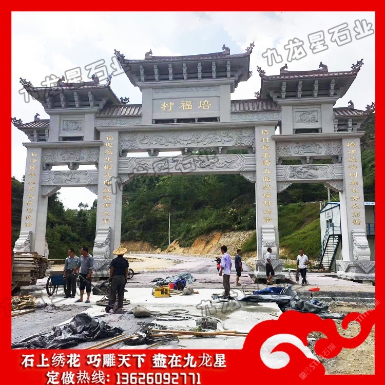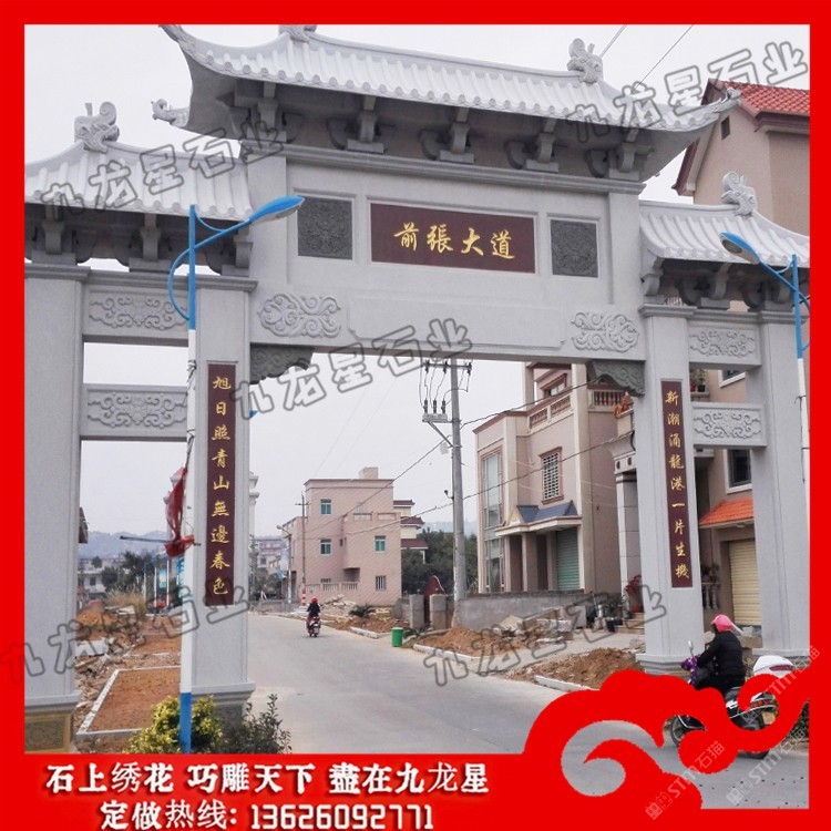 發(fā)布信息: 農(nóng)村村口牌坊 石牌坊生產(chǎn)廠家——九龍星石業(yè)。 農(nóng)村村口牌坊制作內(nèi)容豐富,雕刻精美,每一座石牌坊都瑰麗華美,都是經(jīng)過石牌坊雕刻廠家精雕細刻加工而成的。 從農(nóng)村村口牌坊設(shè)計來看,規(guī)格主要可以分為單門牌坊、三門牌坊、五門牌坊等,在樣式上可以考慮沖天式牌坊或者不出頭式牌坊。此外石牌坊本身的雕刻圖案選擇也非常多,根據(jù)當?shù)氐娘L(fēng)土人情以及文化特色等,在牌坊的設(shè)計上都會有很大的不同,考慮村莊石牌坊多少錢,也會考慮到牌坊本身的工藝設(shè)計以及雕刻的精細度情況,做工越是精致牌坊的價格越高,做工要是普通的話相對來說也就不需要那么多錢。