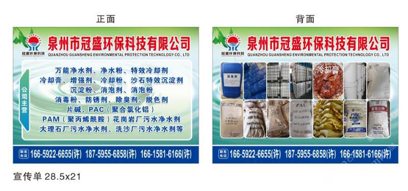 發(fā)布信息: 冠盛環(huán)??萍?6659226655 主營產(chǎn)品:凈水劑,冷卻劑,冷卻粉,大理石人造石專用凈水劑,沉淀粉,消泡劑,消毒凈水劑,防銹凈水劑,除銹劑,除臭劑,聚丙烯酰胺,聚合氯化鋁,鹵精,洗沙專用凈水劑,壓濾機專用凈水劑,陶瓷廠專用凈水劑(黃藥 白藥)等所有水處理環(huán)保材料……