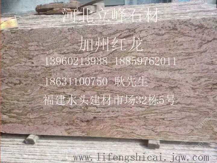 發(fā)布信息: 加州紅龍全球供應(yīng)商,雪浪石,小米黃,黑白山水石。電話13960213938微信同號(hào)。地址,水頭建材市場(chǎng)32棟15號(hào)。海西建材市場(chǎng)11棟10號(hào)。水頭工廠地址,建材市場(chǎng)對(duì)過(guò),銘亮石材廠?;牧?,海西荒料市場(chǎng)2號(hào)倉(cāng)1號(hào)吊下邊。廠址河北省石家莊市靈壽縣東木佛橋北100米路西。河北荒料,石家莊市靈壽縣南紀(jì)城港源物流。
