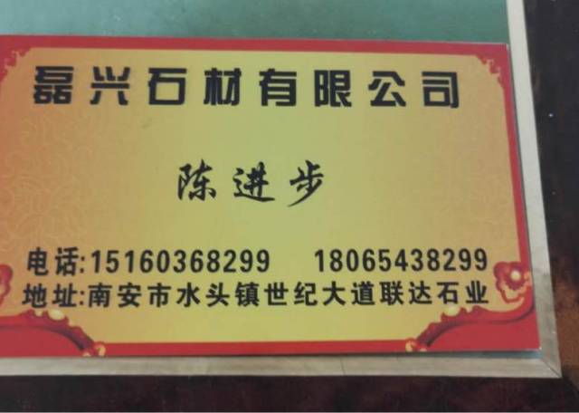 磊興石業(yè) 聯(lián)系人:陳先生    180****8299 查看 151****8299 查看 主營范圍: 大板批發(fā)、荒料、 企業(yè)地址:福建南安水頭鎮(zhèn)雄獅開發(fā)區(qū)石通天下